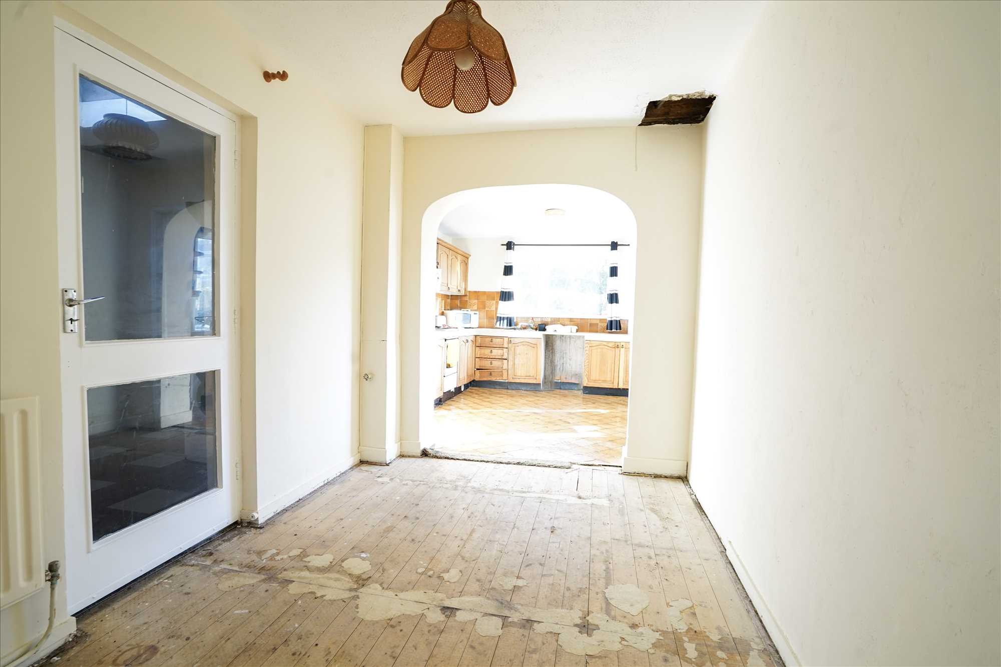 Dining Room: 3.7m x 3.6m. Wood Floor, archway through to kitchen