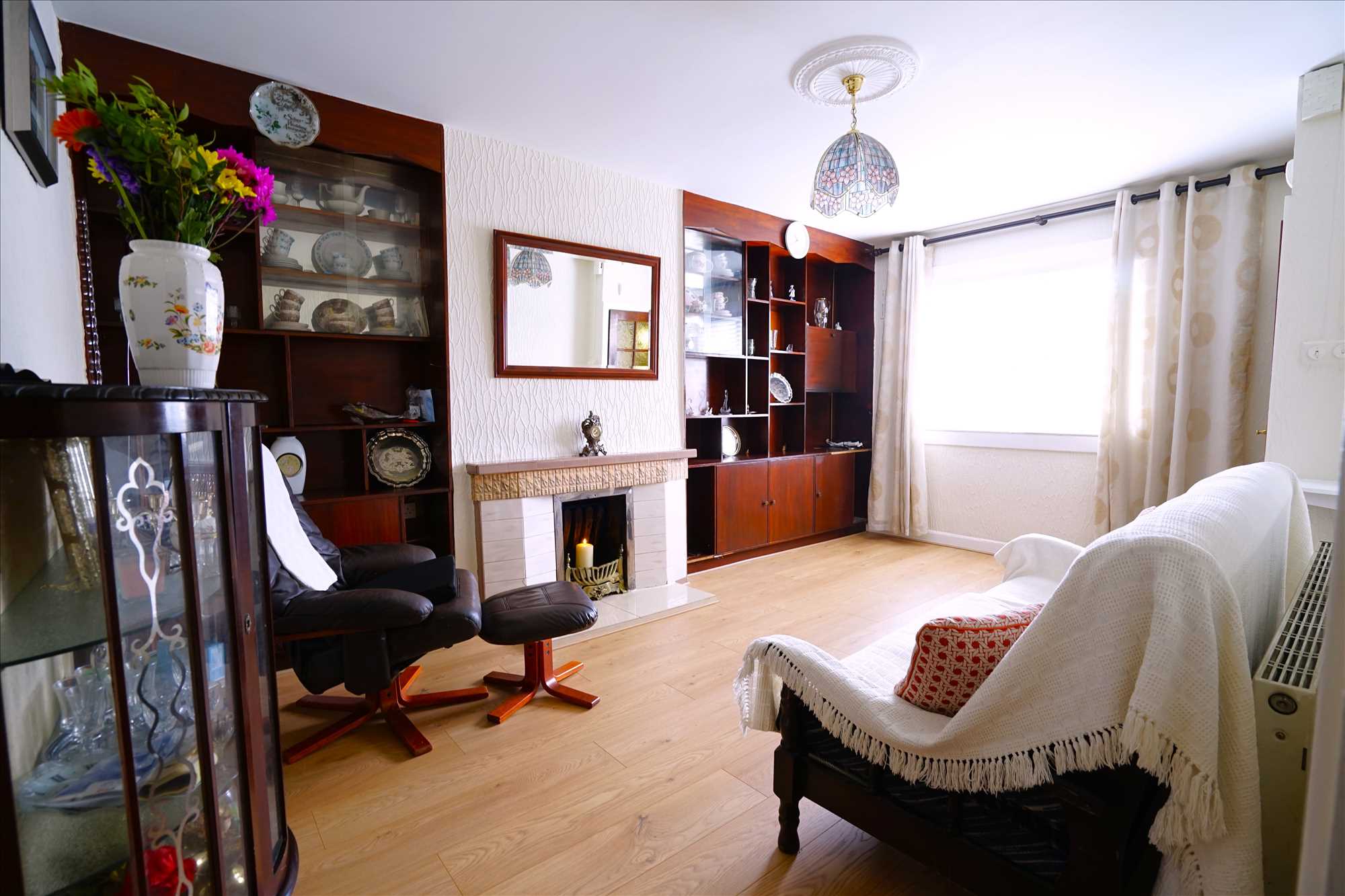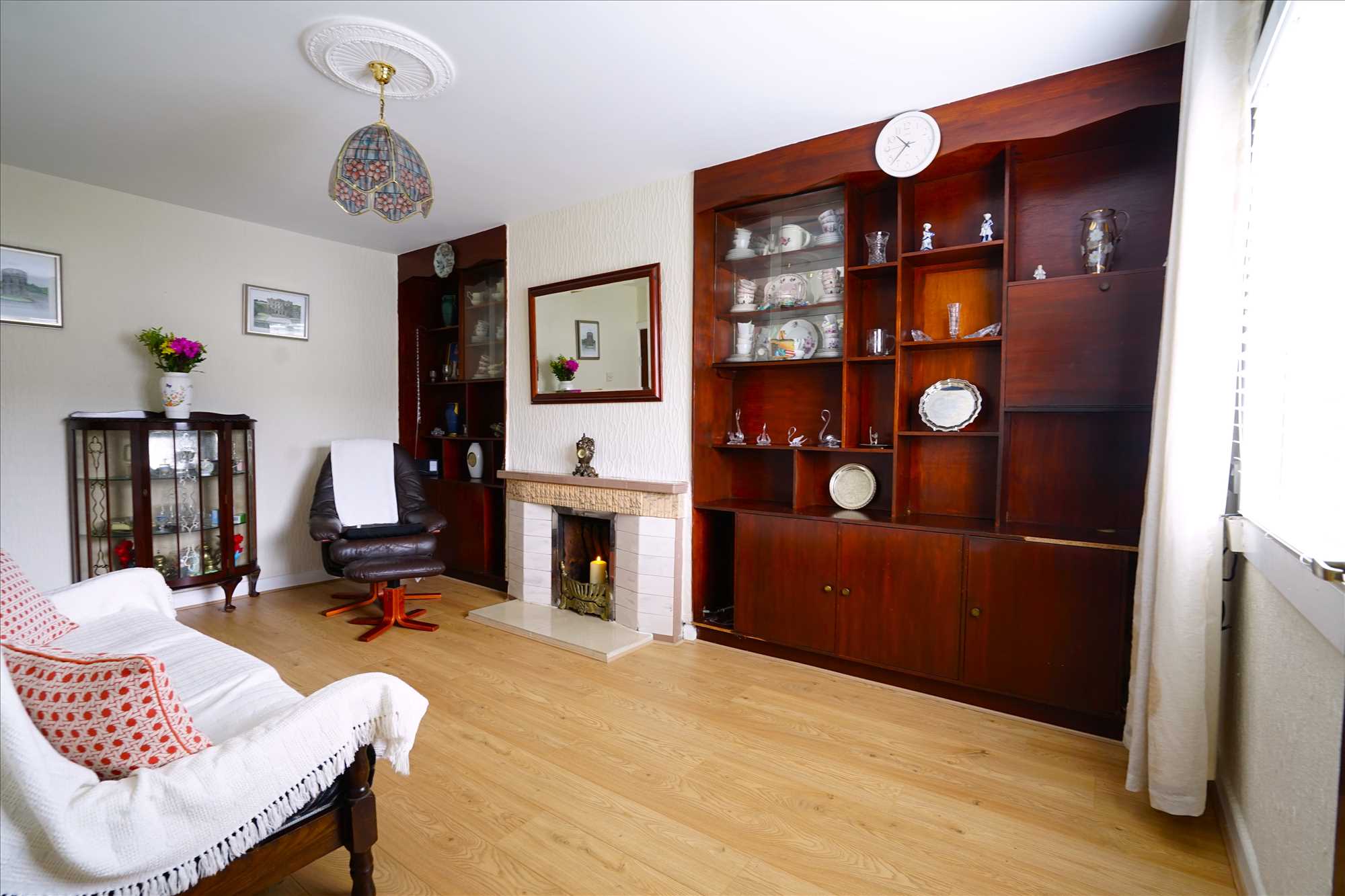 Sitting room: 4.9m x 3.3m. Laminate floor, blinds, fireplace with open fire.
