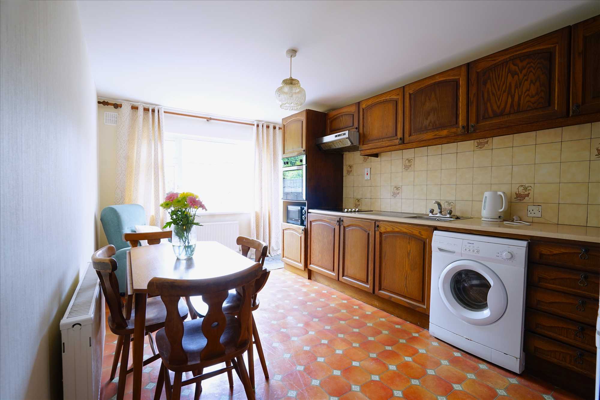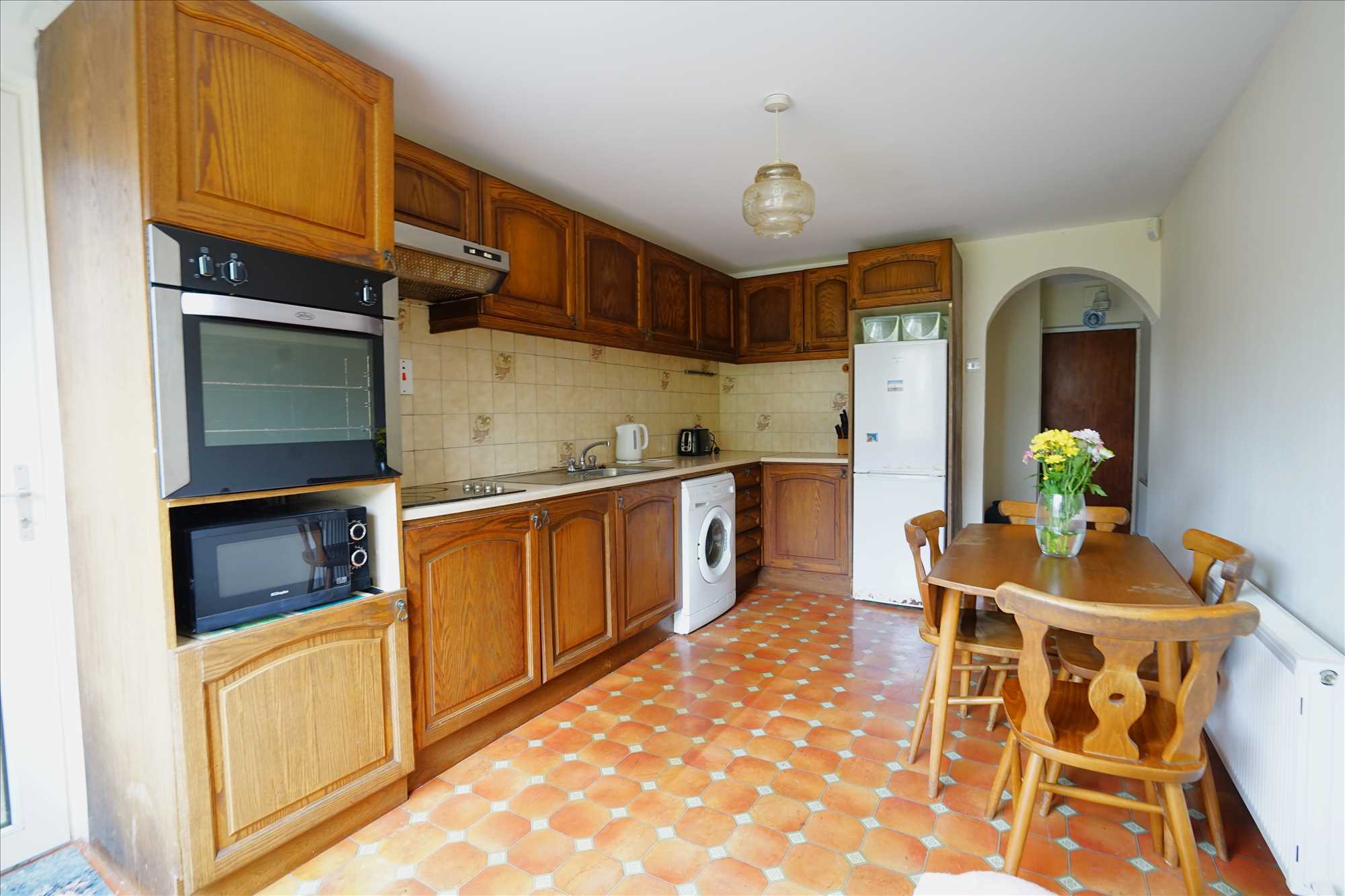 Kitchen: 5m x 2.9m. Lino floor, fitted kitchen with integrated oven & hob, door to rear garden.