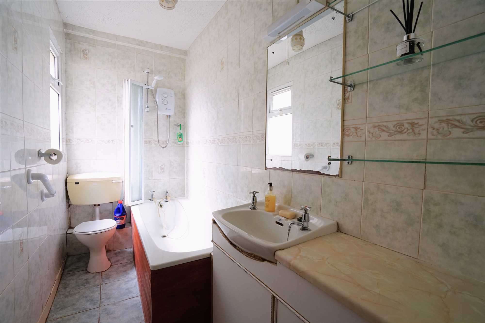 Bathroom: 1.3m x 2.8m. Fully tiled, WC, wash hand basin, bath with electric shower.