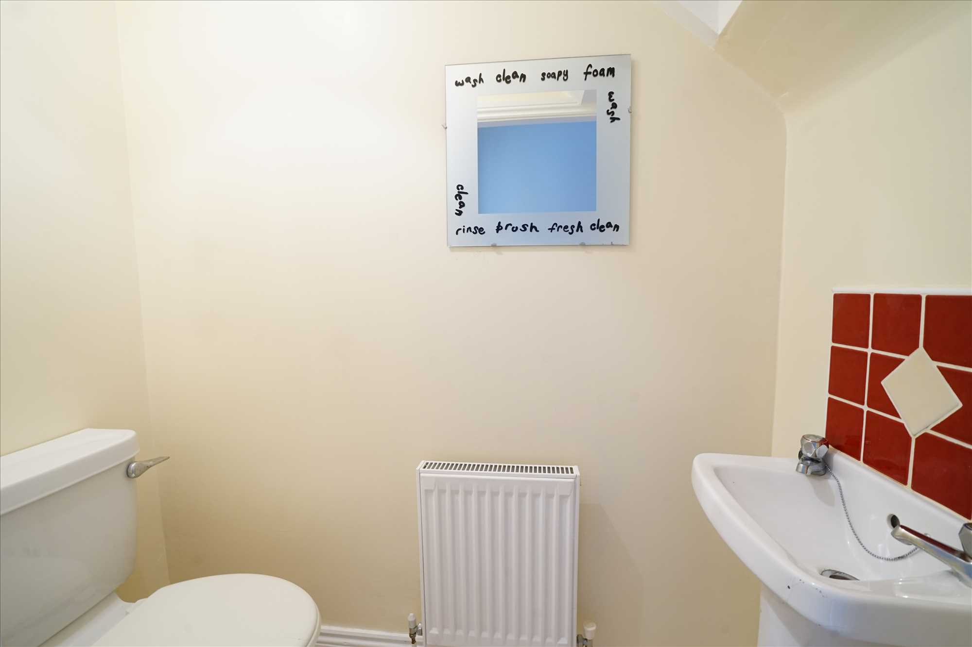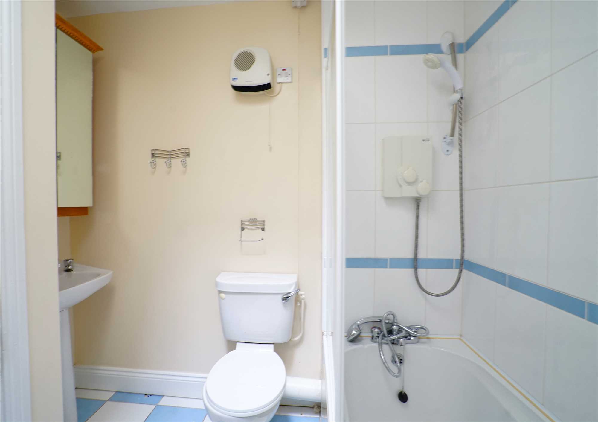 WC: 1.87m x 0.97m. Tiled floor, wash hand basin, electric shower over bath, toilet