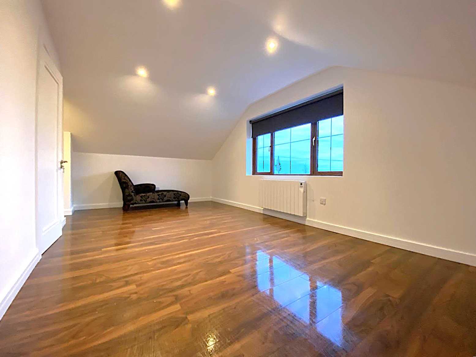 Master Bedroom: 5.55m x 3.92m. Bay: 0.6m x 1.79m. Laminate floor, bay window with blinds, fitted wardrobes with built in radio.