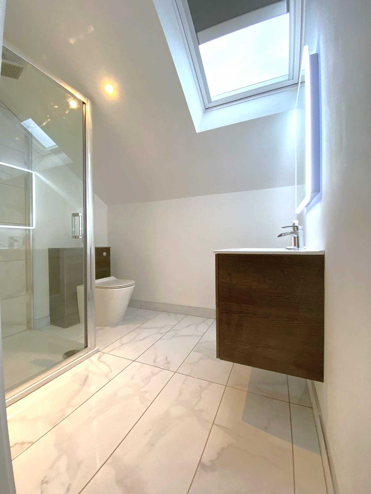 En-suite: 1.63m x 2.27m. Partially tiled, WC, wash hand basin with vanity unit, rainfall shower.