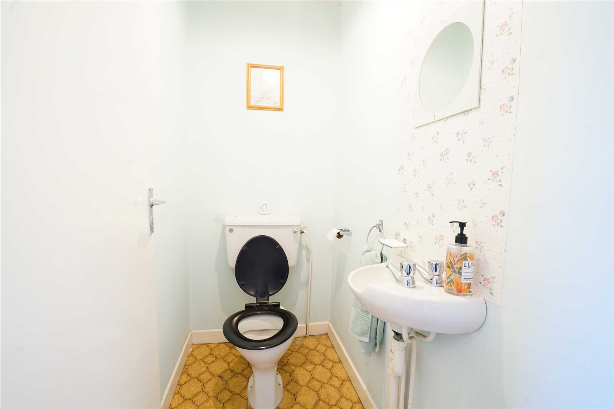 WC: 1.77m x 1m. Lino floor, WC, wash hand basin.
