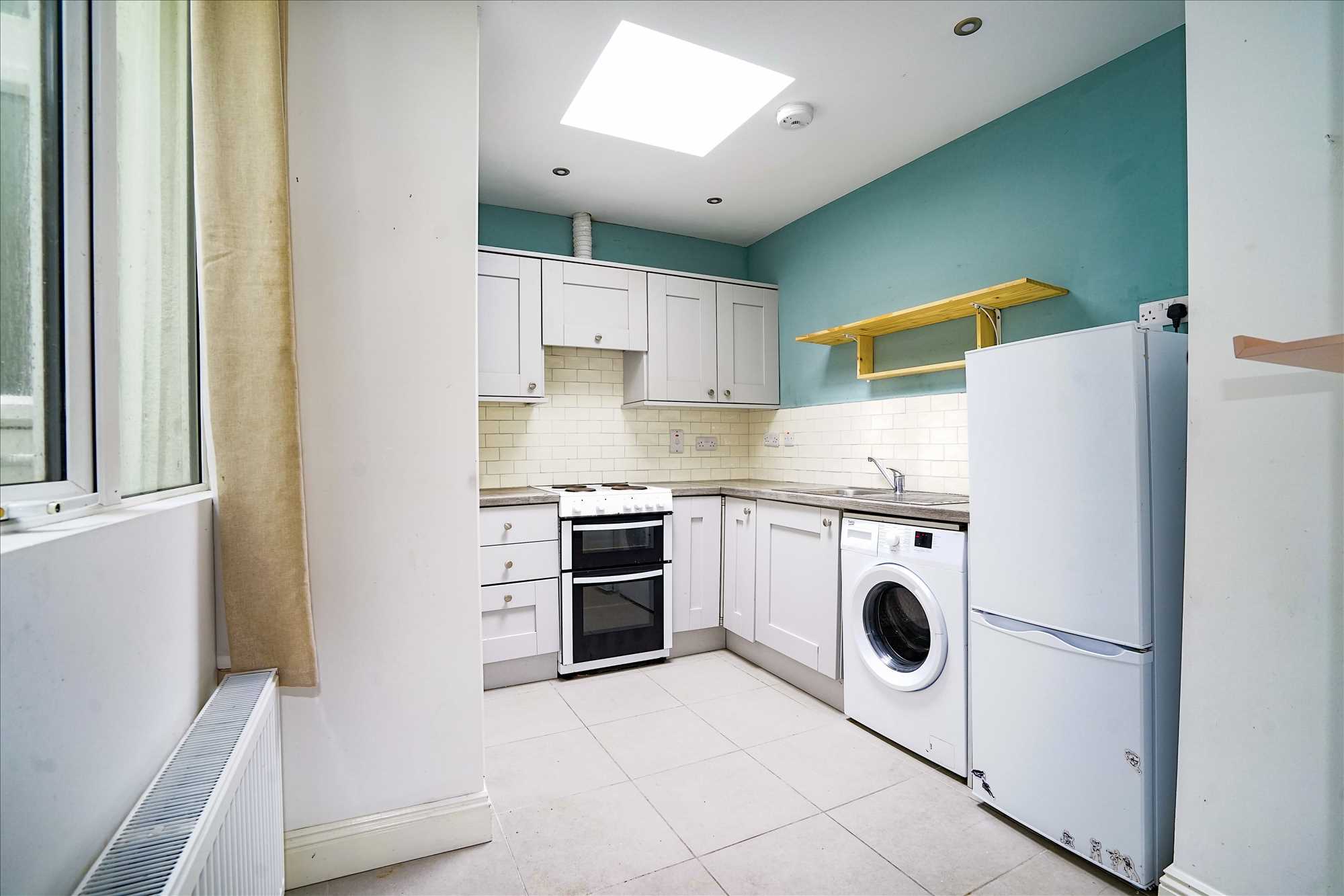 Kitchen: 3.2m x 2.7m. Tiled floor, fitted kitchen, sky light.