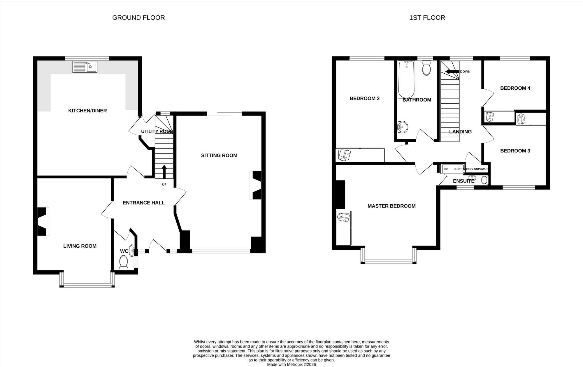 The generously proportioned accommodation comprises a welcoming entrance hallway, sitting room, spacious kitchen/diner, utility room, living room, and guest WC on the ground floor. The first floor hosts four well-appointed bedrooms, including a master bedroom with en-suite, together with a family bathroom.