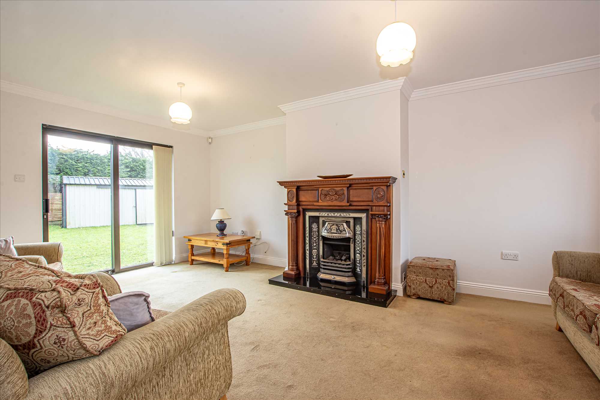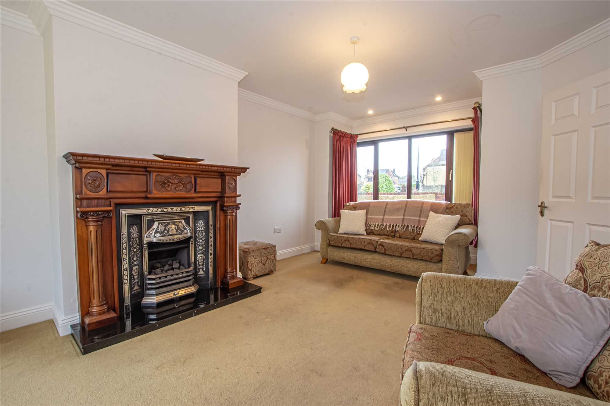 Sitting Room: 5.88m x 3.78m plus Bay 0.85m x 2.33m. Carpet, blinds, bay window, fireplace with gas fire, sliding door to rear garden.