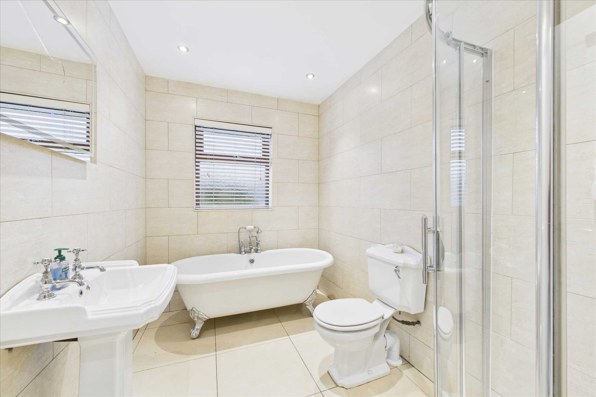 Bathroom: 3.01m x 2m. Fully tiled, WC, wash hand basin, free standing bath, corner electric shower.