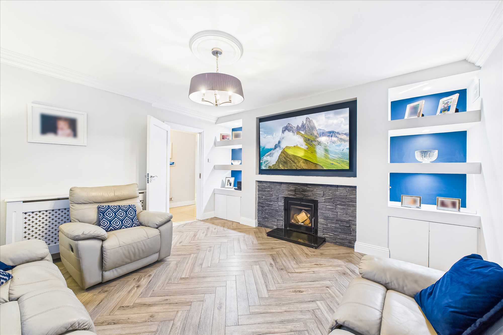Sitting Room: 4.6m x 4.2m. Wood heating, blinds, feature wall with stove.